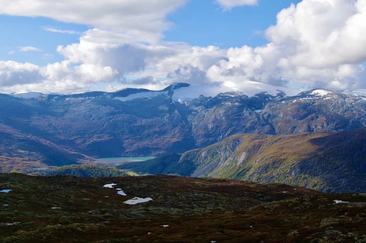 Utsikt fra den sørlige toppen av Vågsberget 1256 moh. mot Hest, Såta og Solsetnosi